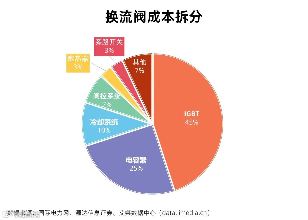 换流阀是特高压直流输电系统的“心脏”,决定交直流转换的效率和可靠性。当前市场格局中,国电南瑞换流阀仍居第一,中国西电、许继电气份额持续上升。柔性直流换流阀主要由 IGBT、电容器、旁路开关等组成,其中IGBT是最核心的零部件,在换流阀总价值量中占比高达45%,其次是电容器,占比25%。