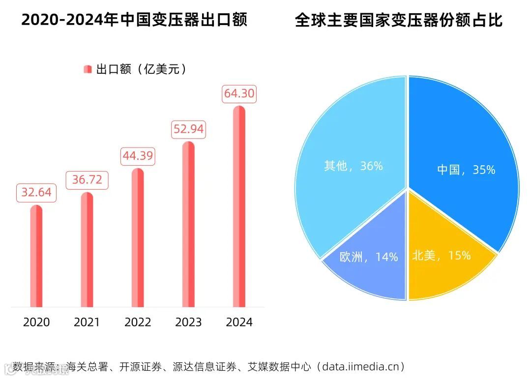 出口表现同样亮眼,2020-2024年中国变压器出口金额从32.64亿美元增长至64.30亿美元,年复合增长率达18.47%,目前全球份额占比高达35%,欧洲(14%)、北美(15%)市场已实现规模化出口,随着海外电网建设加速,出口规模有望进一步扩大。