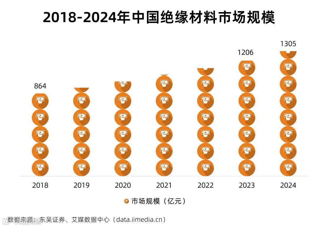 绝缘材料是保障特高压设备安全运行的关键,2024年中国绝缘材料行业市场规模约1305亿元,同比增长8.2%。随着电力、通信和家电等行业快速发展,中国绝缘材料行业规模持续扩张,国产替代加速,2018-2023年市场规模从864亿元增长至1206亿元,复合增长率为6.9%。