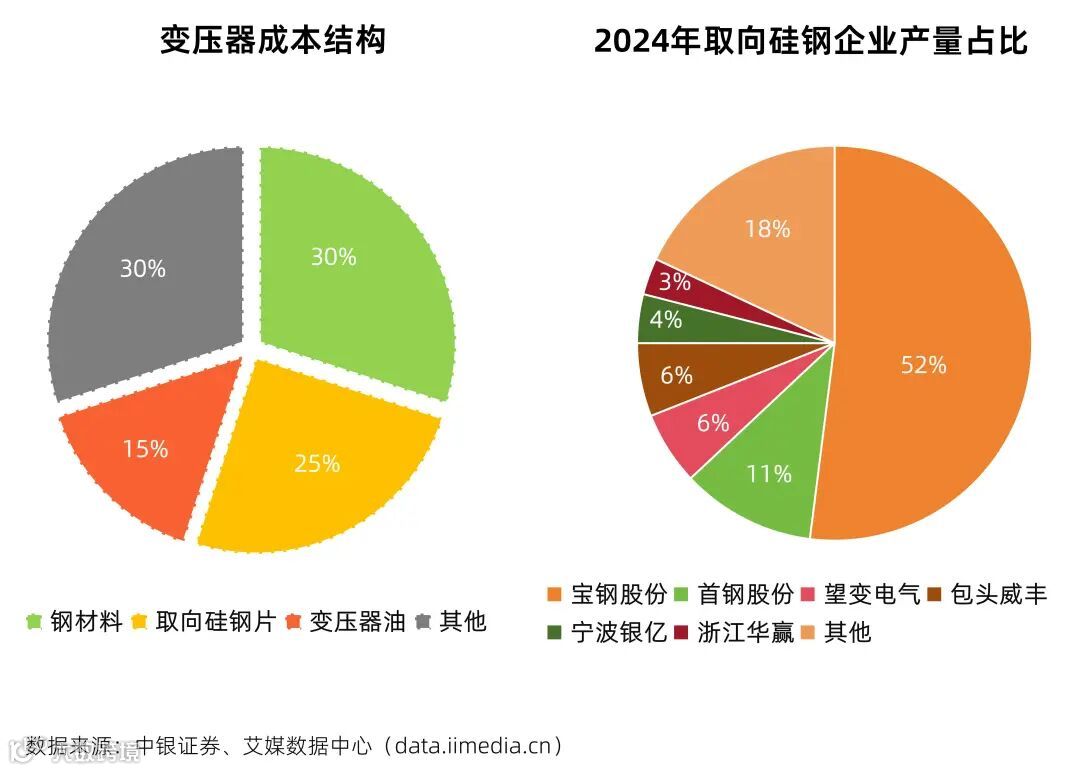 取向硅钢片作为特高压中游变压器的核心材料,占变压器成本的25%。该行业技术壁垒高,国内产能较为集中,形成“国企主导、民企快速发展”的格局,2024年产量前六企业分别为宝钢股份(52%)、首钢股份(11%)、望变电气(6%)、包头威丰(6%)、宁波银亿(4%)、浙江华赢(3%)。