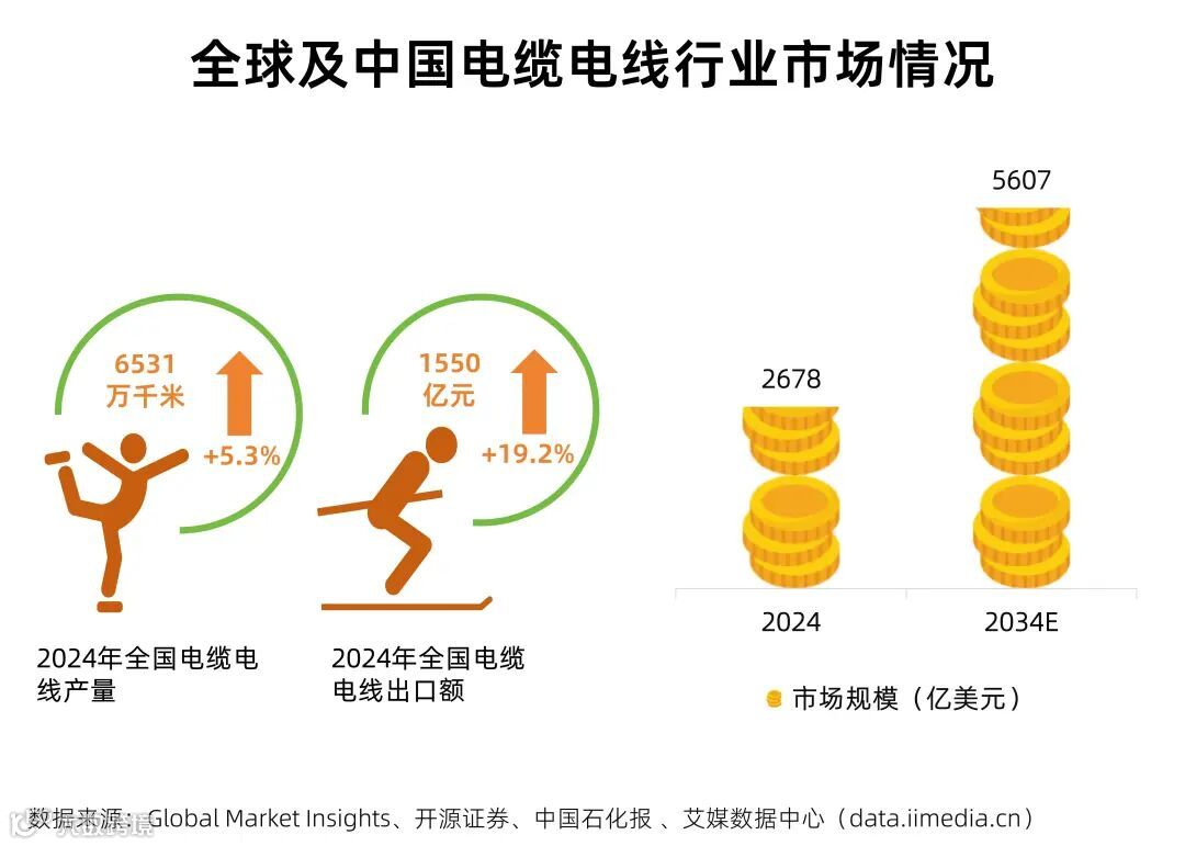 作为特高压输电网建设的关键配套,电线电缆行业受益于全球电力需求增长与基础设施升级,市场规模持续扩大。2024年全球电线电缆市场规模达2678亿美元,预计2034年将突破5600亿美元。