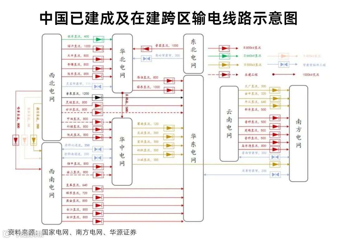特高压分为直流特高压和交流特高压,前者可承担跨区域的网对网电力输送,一直是远距离电力外送的主力;后者仅能承担电网区域内部的电力输送。因此,西南水电、三北火电及新能源等跨省跨区输电的主力工作主要由直流特高压承担,交流特高压更多作为网架支撑的功能。
