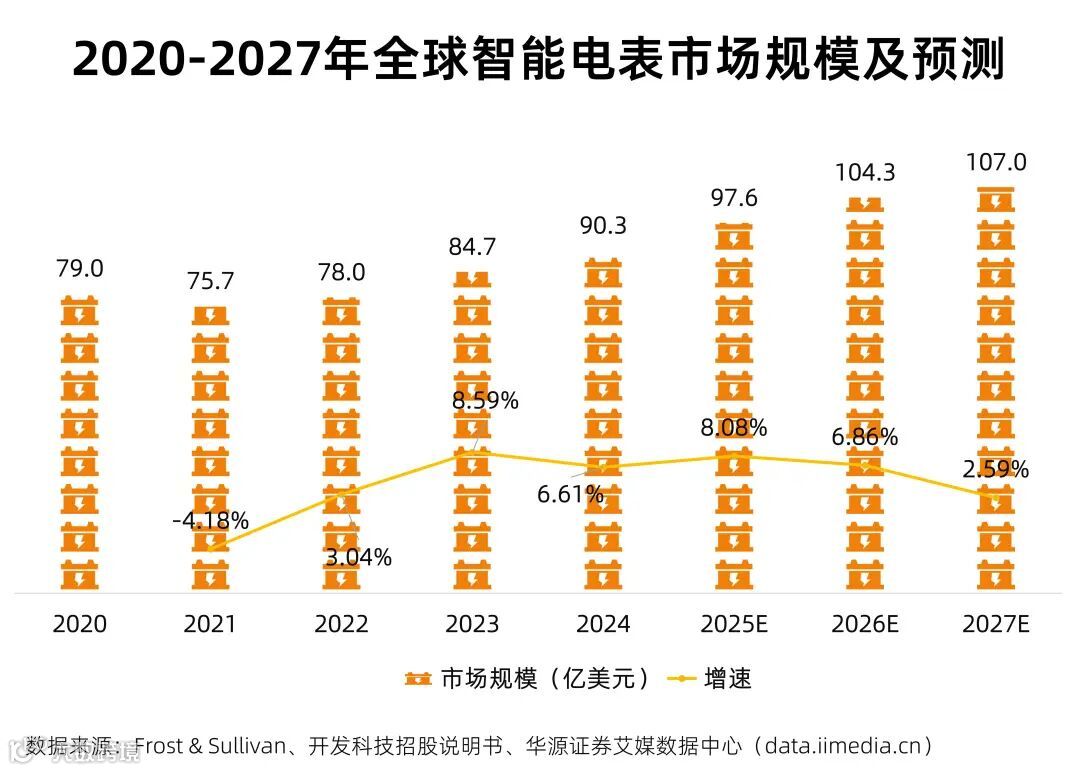 智能电表作为智能电网运维这一体系中数据收集、监测及交互的核心基础设施,其市场增长与应用落地备受关注。数据显示,全球智能电表市场规模将从2022年的78.0亿美元增长至2027年的107.0亿美元,复合增长率达6.69%。