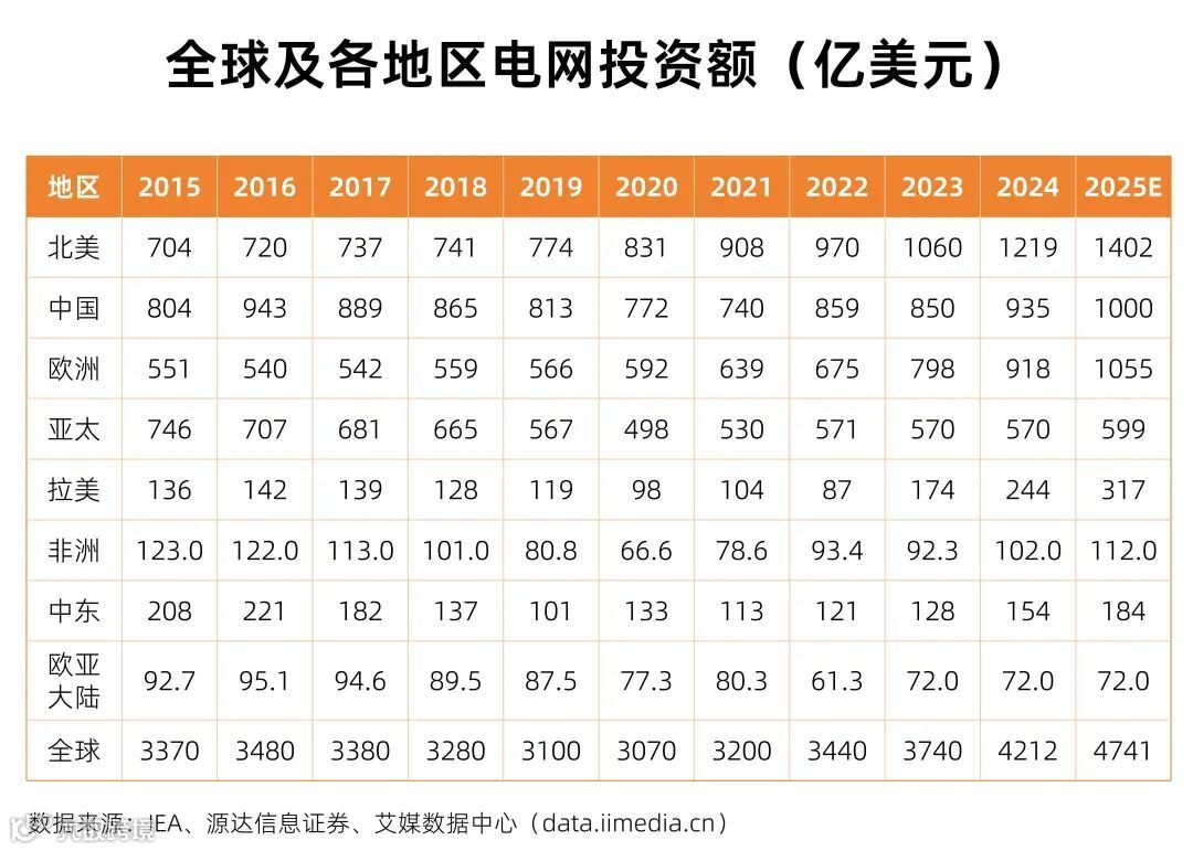 全球市场方面,2015年以来全球电网投资额持续维持在3000亿美元以上,2020年后进入加速增长通道,2024年投资额达4212亿美元,同比增长12.6%,其中拉美、中东、欧洲增速领跑,分别同比增长40.2%、20.3%、15.0%。