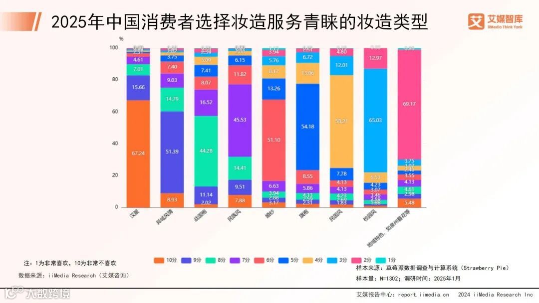 iiMedia Research(艾媒咨询)数据显示,汉服妆造以高达 67.24% 的10分评价占比独占鳌头,成为最受追捧的类型,彰显出汉服所承载的深厚华夏文化在当下的强大吸引力。而异域风情妆造也不容小觑,凭借 51.39% 的9分评价紧随其后,反映出消费者对多元文化的包容与好奇,渴望通过妆造体验不同地域的独特魅力。