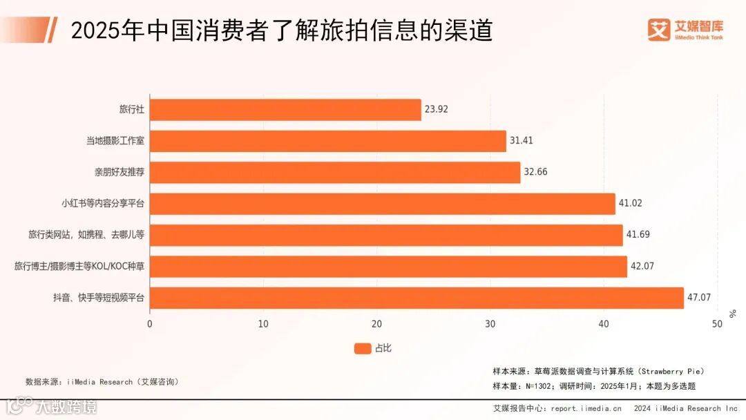 iiMedia Research(艾媒咨询)数据显示,抖音、快手等短视频平台以47.07%的占比位居首位,成为消费者了解旅拍信息的主要渠道。小红书等内容分享平台和旅行类网站如携程、去哪儿等紧随其后,占比分别为41.02%和41.69%,显示出内容平台和在线旅游网站的影响力。旅行博主/摄影博主等KOL/KOC种草占比42.07%,亲朋好友推荐占比32.66%,当地摄影工作室占比31.41%,均显示出口碑和社交影响力的重要性。旅行社占比最低,仅为23.92%,说明传统渠道的影响力正在减弱。