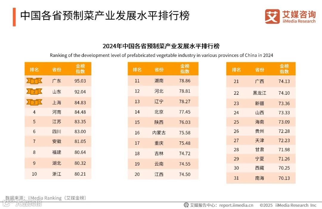 iiMedia Ranking(艾媒金榜)数据显示,2024年中国各省预制菜产业发展水平排行榜前10名有广东、山东、上海、河南、江苏、四川、安徽、福建、湖北、浙江。