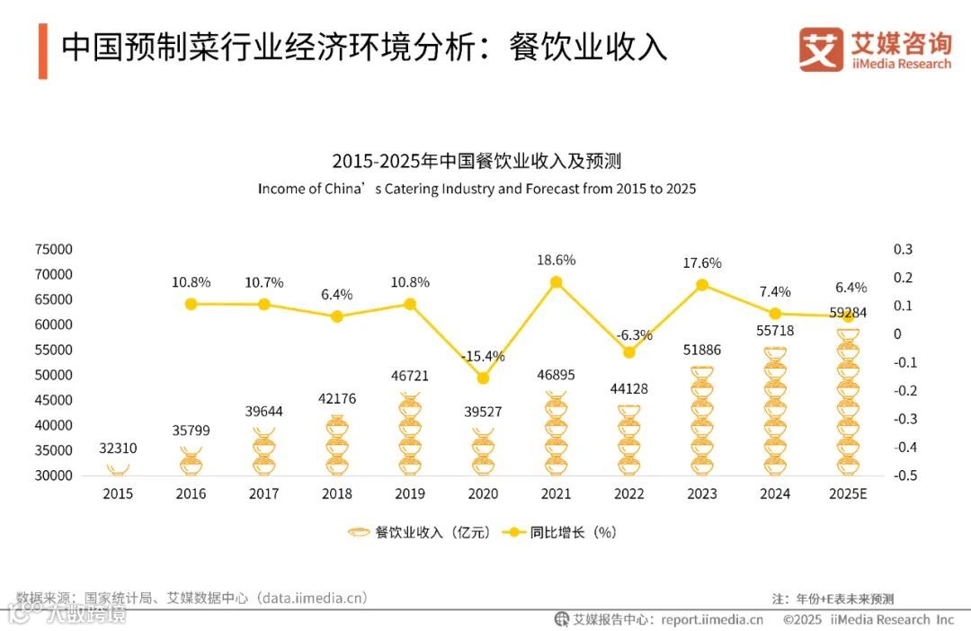 数据显示,中国餐饮行业规模呈现不断扩大的趋势,2024年中国餐饮行业市场规模为55718亿元,同比增长7.4%。这一增长主要受到提振消费政策、“中华美食荟”“餐饮+赛事”“夜经济”“展演+美食”等活动的推动,消费者外出就餐的热情高涨,进一步拉动了餐饮市场的需求。目前,餐饮行业在短期内将平稳增长,预计2025年市场规模将达59284亿元。