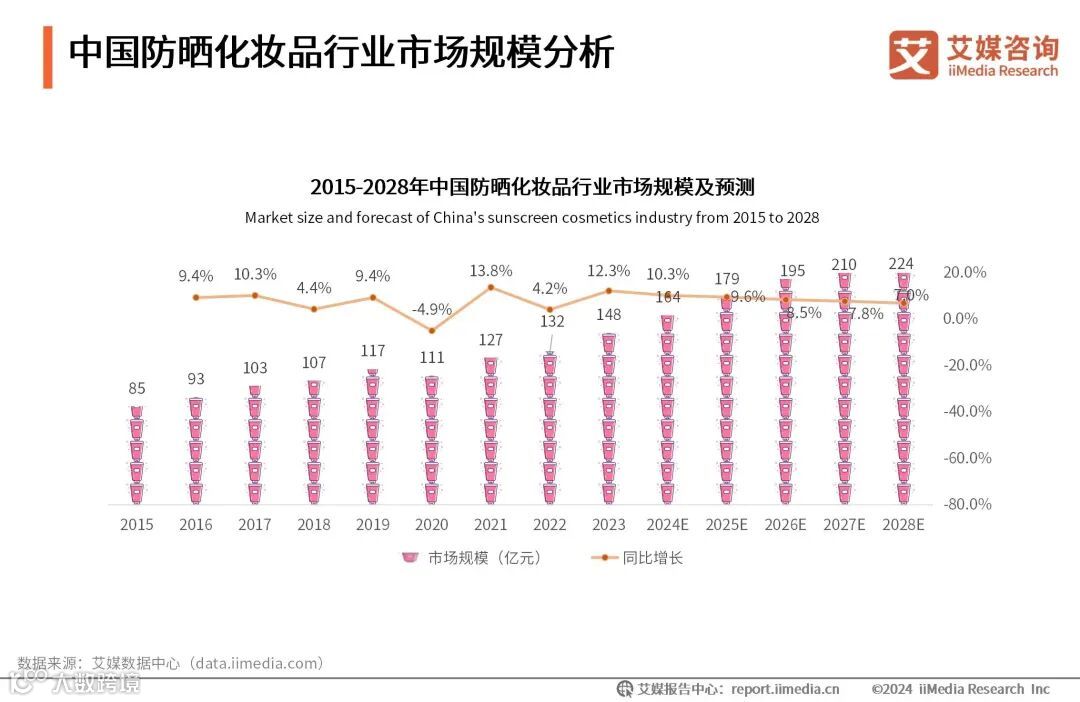 iiMedia Research(艾媒咨询)数据显示,2023年中国防晒化妆品行业市场规模为148亿元,同比增长12.3%,预计2028年中国防晒化妆品市场规模有望达到224亿元。艾媒咨询分析师认为,2023年以来,户外运动和旅游出行消费迎来快速增长,防晒化妆品在户外、旅游出行中扮演着至关重要的角色。未来,户外运动和旅游出行等消费将成为防晒化妆品市场的重要驱动力之一,推动中国防晒化妆品市场的消费增长。