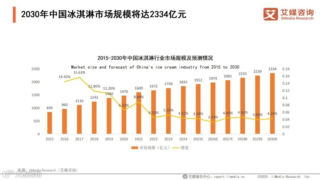 iiMedia Research(艾媒咨询)数据显示,2024年中国冰淇淋市场规模达到1835亿元,2030年有望达到2334亿元。艾媒咨询分析师认为,中国家庭收入和家庭消费水平逐年提高,人们对于休闲食品的需求量提升,中国冰淇淋行业的市场规模也在逐年上升。