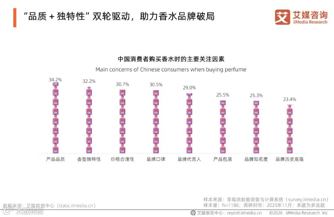 iiMedia Research(艾媒咨询)数据显示,产品品质(34.2%)与香型独特性(32.2%)成为消费者购买香水时的主要关注因素。艾媒咨询分析师认为,随着市场竞争加剧与消费者认知成熟,单纯的品牌溢价已难以打动用户,核心产品力与差异化香调设计成为品牌突围关键。品牌需强化原料甄选与调香创新,通过兼具品质感与独特性的产品,精准契合消费者对高端化、个性化的需求升级。