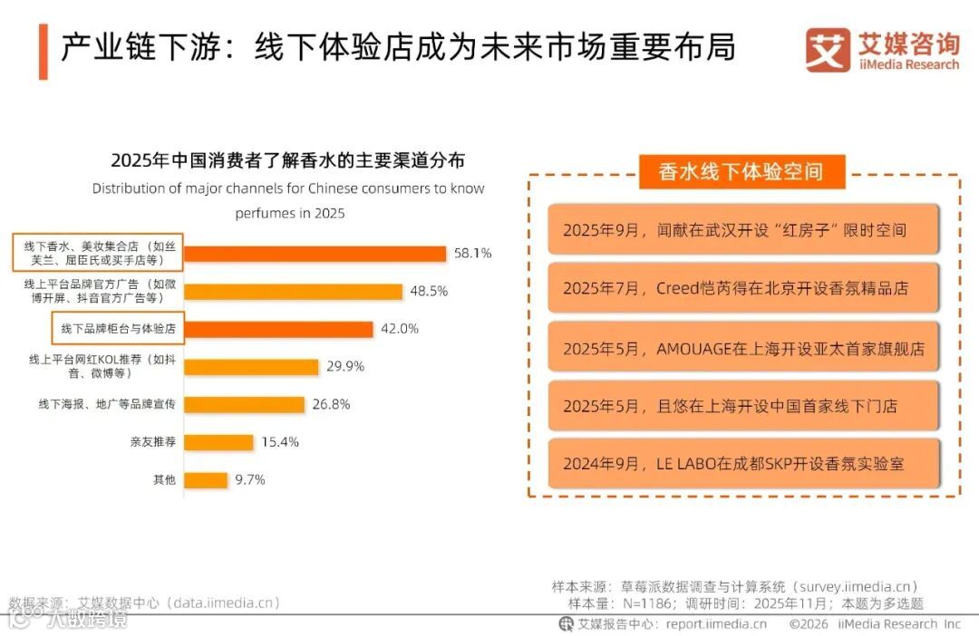 iiMedia Research(艾媒咨询)数据显示,58.1%消费者通过线下香水、美妆集合店了解香水,42.0%的消费者则通过线下品牌柜台与体验店了解香水,这表明线下场景已成为连接消费者与香水品牌的核心纽带。艾媒咨询分析师认为,随着消费者对个性化、体验感需求升级,线下体验店不仅是产品展示窗口,更成为品牌构建差异化竞争力的关键载体,将成为未来香水市场品牌布局的核心赛道。