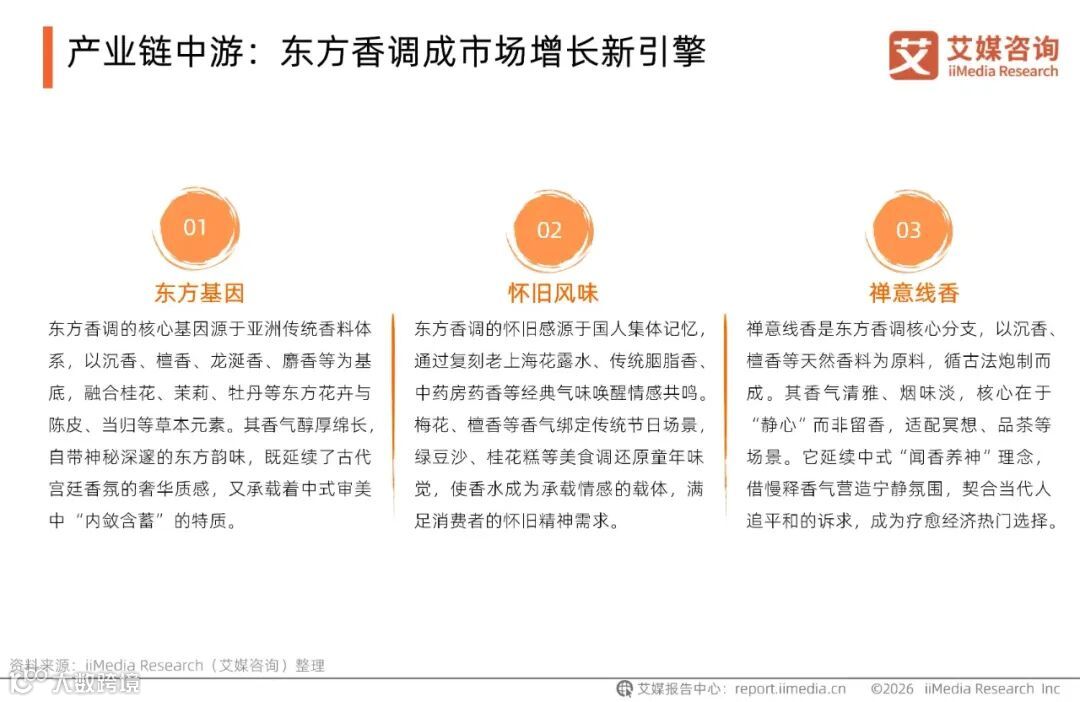 近年来,东方香调凭借沉香、檀香等天然香料构建的醇厚基底,叠加中式审美中内敛雅致的文化底蕴,精准契合当代消费者对文化认同与情绪疗愈的双重需求,成为中国香水市场极具增长潜力的热门趋势。艾媒咨询分析师认为,未来本土品牌需进一步深化文化内核挖掘,将传统香道智慧与现代生活场景深度融合,在保留东方韵味的同时实现现代表达创新,方能持续强化竞争力、赢得市场青睐。