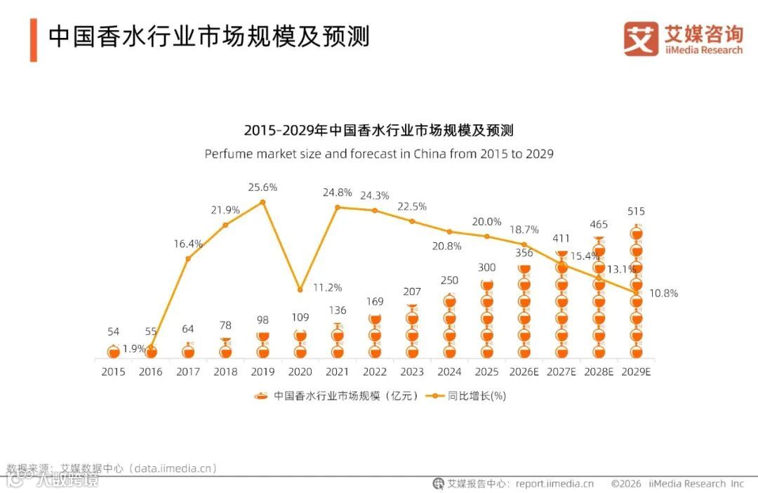 iiMedia Research(艾媒咨询)数据显示,2024年中国香水行业市场规模达250亿元,同比增长20.8%,预计2029年有望达到515亿元。艾媒咨询分析师认为,在“嗅觉经济”崛起与本土品牌“东方叙事”成功破圈的背景下,中国香水市场展现出蓬勃活力,未来有望凭借这一强劲势头,成为全球香水市场的重要增长引擎。