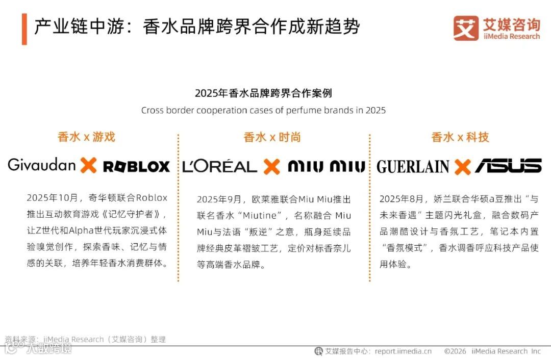 在场景化需求扩容的驱动下,香水品牌跨界合作已成行业新趋势。从联名时尚品牌、餐饮酒店,到携手博物馆、游戏平台,合作领域持续拓宽。艾媒咨询分析师认为,这类合作既打破品类边界、丰富消费体验,又助力品牌触达多元客群、强化文化属性。未来,跨界将成为香水品牌破圈增长的核心路径,推动行业持续创新升级。