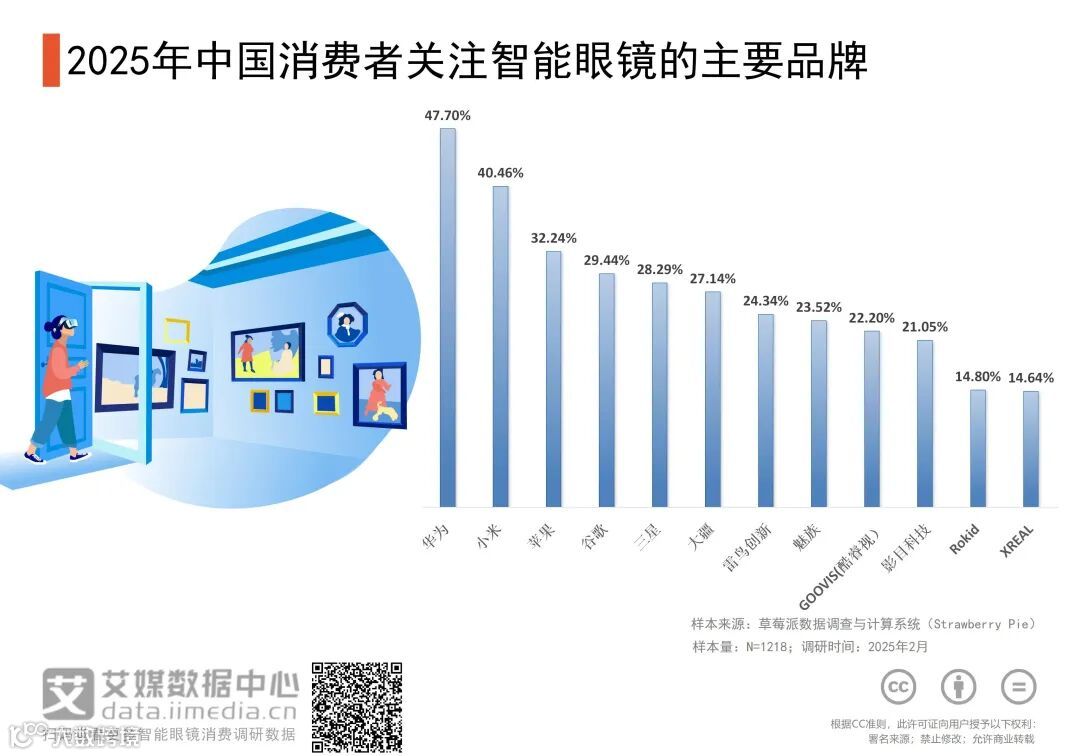 iiMedia Research(艾媒咨询)数据显示,在中国消费者关注的智能眼镜品牌调研中,位列前五的分别是华为(47.70%)、小米(40.46%)、苹果(32.24%)、谷歌(29.44%)、三星(28.29%)。