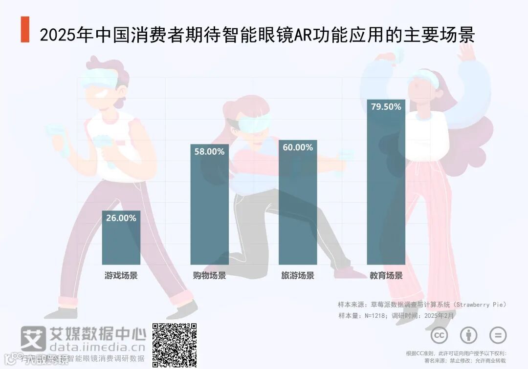 iiMedia Research(艾媒咨询)数据显示,在中国消费者期待智能眼镜AR功能应用的主要场景调研中,79.50%消费者会选择教育场景(如虚拟学习、互动教学等),60.00%消费者会选择旅游场景(如景点导览、历史文化展示等),58.00%消费者会选择购物场景(如虚拟试穿、商品信息展示等),26.00%消费者会选择游戏场景(如沉浸式游戏体验等)。