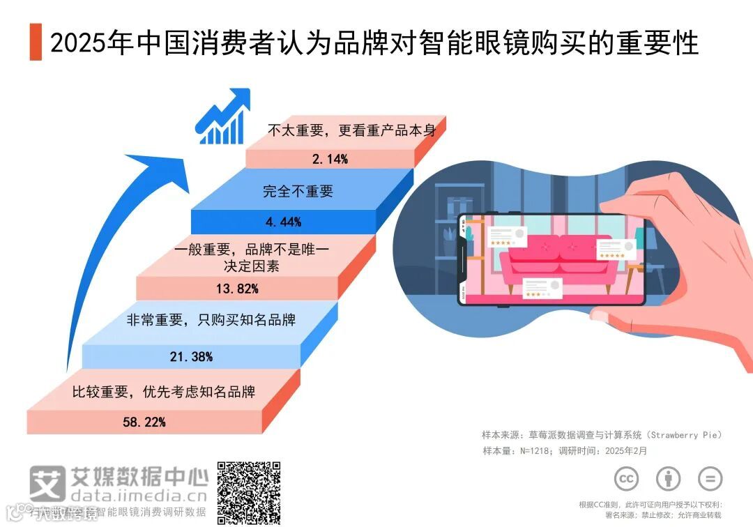 iiMedia Research(艾媒咨询)数据显示,在中国消费者认为品牌对智能眼镜购买的重要性调研中,21.38%的消费者认为品牌非常重要,只会选择购买知名品牌;58.22%的消费者认为品牌比较重要,会优先考虑知名品牌;13.82%的消费者认为品牌的重要性一般,不是决定购买的唯一因素;2.14%的消费者认为品牌不太重要,更看重产品本身;而4.44%的消费者则认为品牌完全不重要。