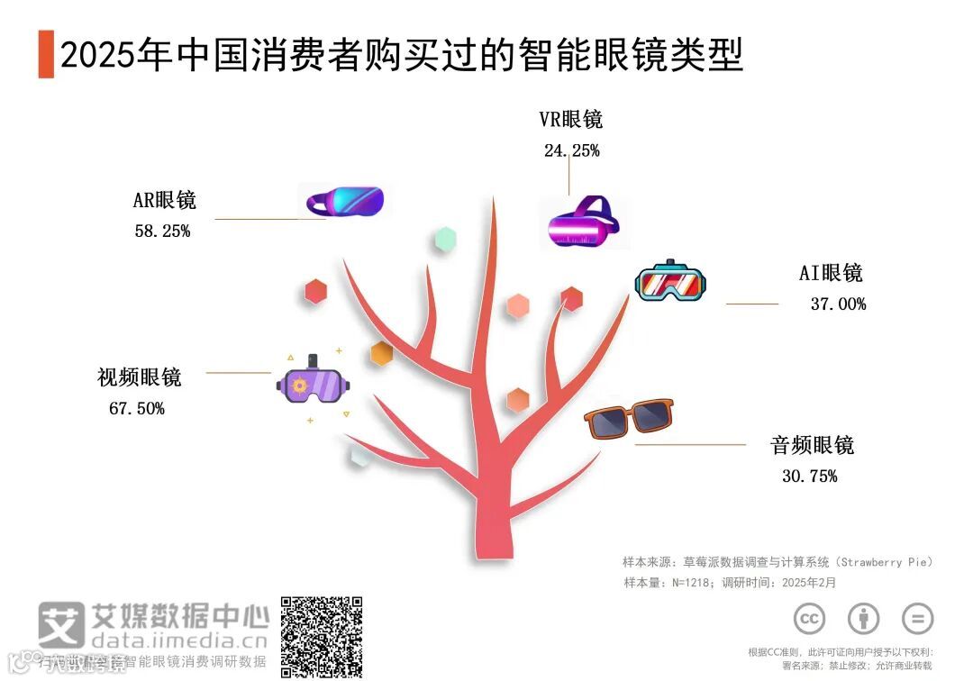 iiMedia Research(艾媒咨询)数据显示,在中国消费者购买过的智能眼镜类型调研中,67.50%的消费者选择视频眼镜,58.25%的消费者偏好AR眼镜,37.00%的消费者选择AI眼镜,而30.75%的消费者则青睐于音频眼镜,另有24.25%的消费者选择了VR眼镜。
