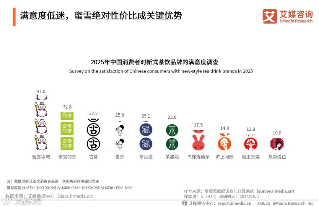 满意度得分是衡量消费者对特定品牌、产品或服务满意程度的量化指标,其数值范围在0至100之间。满意度得分越高,表明消费者对该品牌、产品或服务的整体体验和感知越积极、越满意。iiMedia Research(艾媒咨询)调研数据显示,2025年中国消费者对新式茶饮整体满意度中等偏低,其中蜜雪冰城的满意度最高,达到47.0。艾媒咨询分析师认为,蜜雪冰城的高性价比在各品牌中占优势,各大品牌需在成本控制与差异化产品间找到竞争突破口。