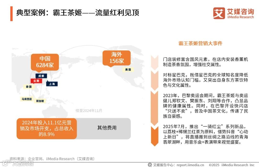 2024年,霸王茶姬的营销费用为11.1亿元,其中7.8亿元用于广告花销,对营收增长起到了重要的推动作用。霸王茶姬主要通过突出文化特色与精准对标来强化品牌辨识度,绑定热点事件结合文化符号借势放大声量,兼顾商业价值与文化输出。但随着流量红利见顶,可能导致品牌陷入“高投入、低转化”的困境。