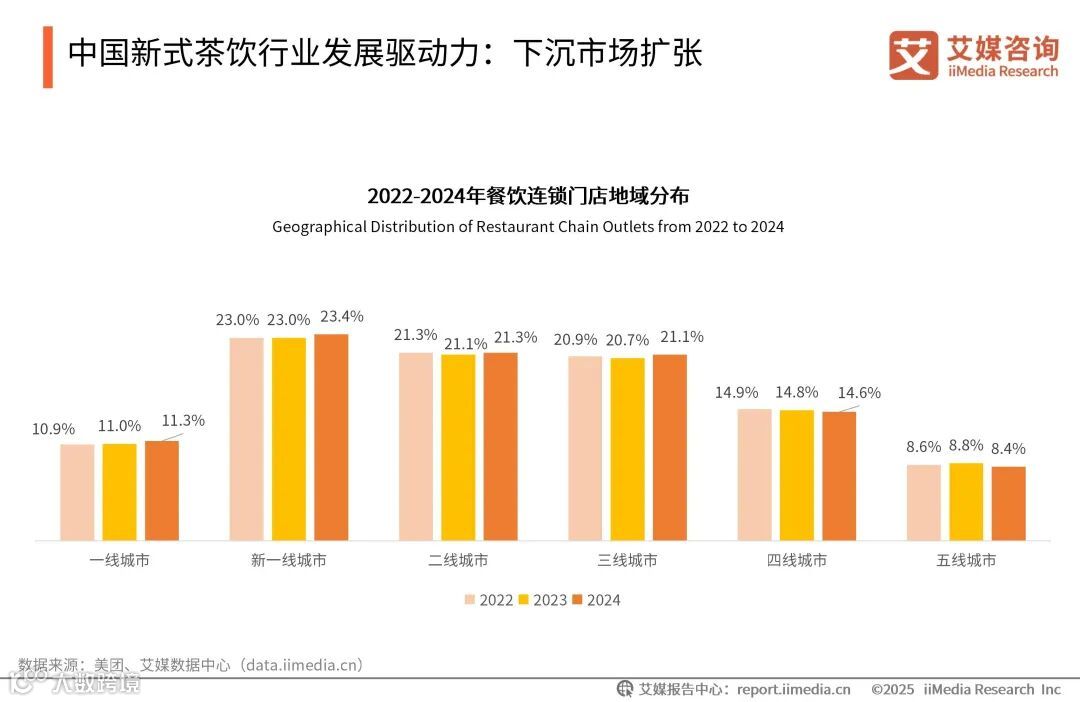 数据显示,中国餐饮连锁门店主要在新一线、二线、三线城市扩张。其中2024年三线城市、新一线城市连锁门店扩张数相较于2023年占比提升最大,提升0.4个百分点,其次是一线城市。艾媒咨询分析师认为,二、三线城市消费升级趋势明显,且运营成本更低,正成为新式茶饮企业竞相布局的核心区域和驱动行业增长的重要引擎。