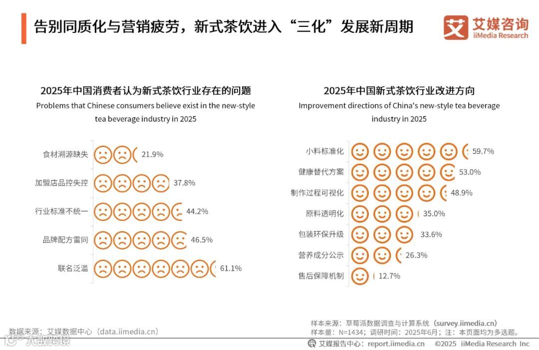 iiMedia Research(艾媒咨询)调研数据显示,联名泛滥(61.1%)和配方雷同(46.5%)是中国消费者认为新式茶饮行业存在的主要问题。小料标准化(59.7%)、健康替代方案(53.0%)是消费者期待新式茶饮行业未来的主要改进方向。艾媒咨询分析师认为,联名泛滥、虚假限量会引起消费者营销疲劳,各品牌配方雷同导致丧失特色。未来,中国新式茶饮行业应向着标准化、透明化、健康化的方向发展。