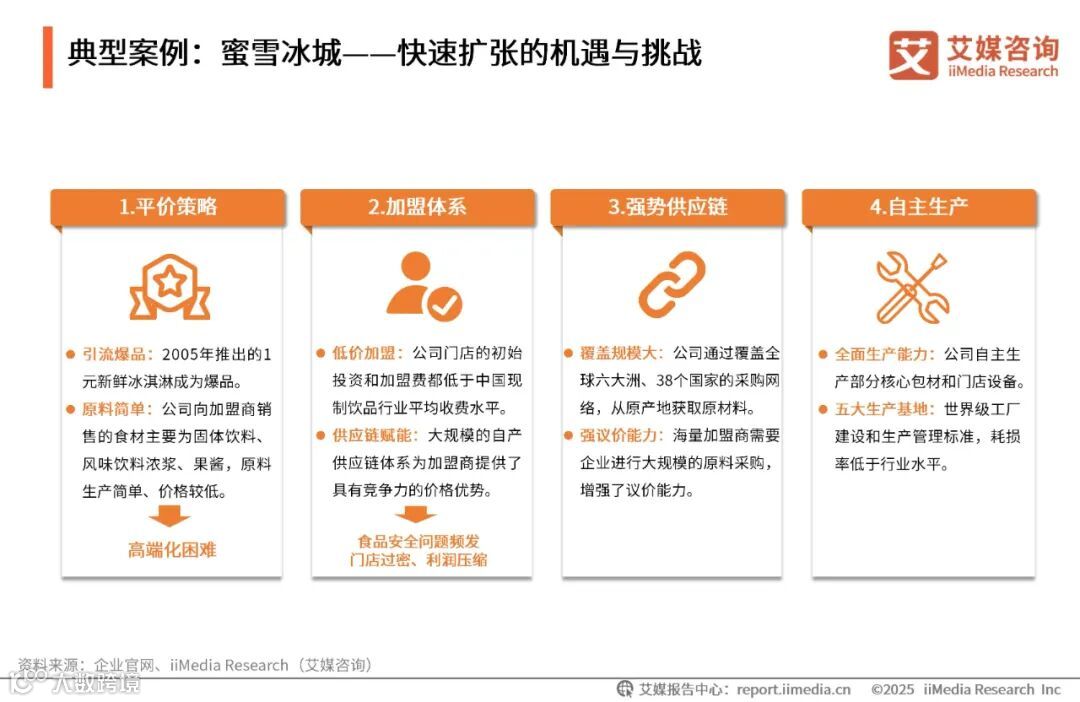 蜜雪冰城的平价定位深入人心,在利用简单低价的原料控制成本的同时,还通过大规模加盟与高效、自营的供应链形成正向循环,不仅保持了品牌扩张速度,还强化了供应链的价格优势。但低价扩张的品牌策略也带来了企业利润难以提升、门店选址过密、管理难度大等问题。