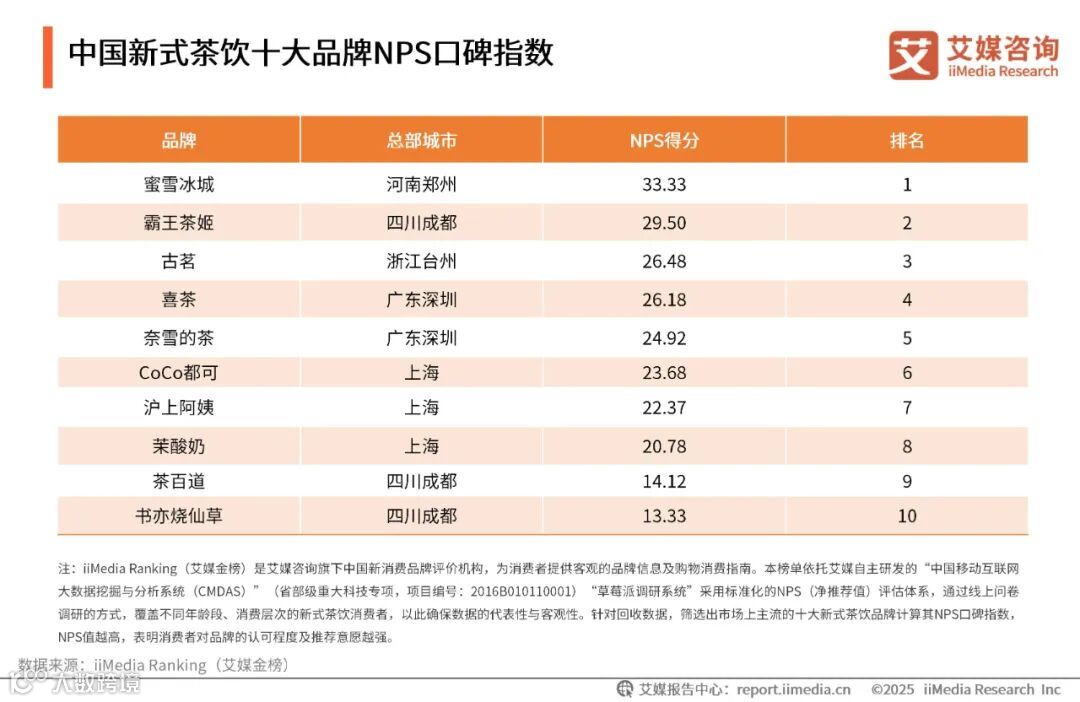 近年来,中国新式茶饮品牌快速崛起,已形成多元且成熟的竞争态势、各价格区间均有明确企业主导的格局。企业通过差异化竞争,从价格、口味、创新、形象等多维度满足消费者需求,推动奶茶行业持续发展。iiMedia Ranking(艾媒金榜)数据显示,蜜雪冰城、霸王茶姬、古茗、喜茶、奈雪的茶位居前五,NPS得分分别为33.33、29.50、26.48、26.18、24.92。