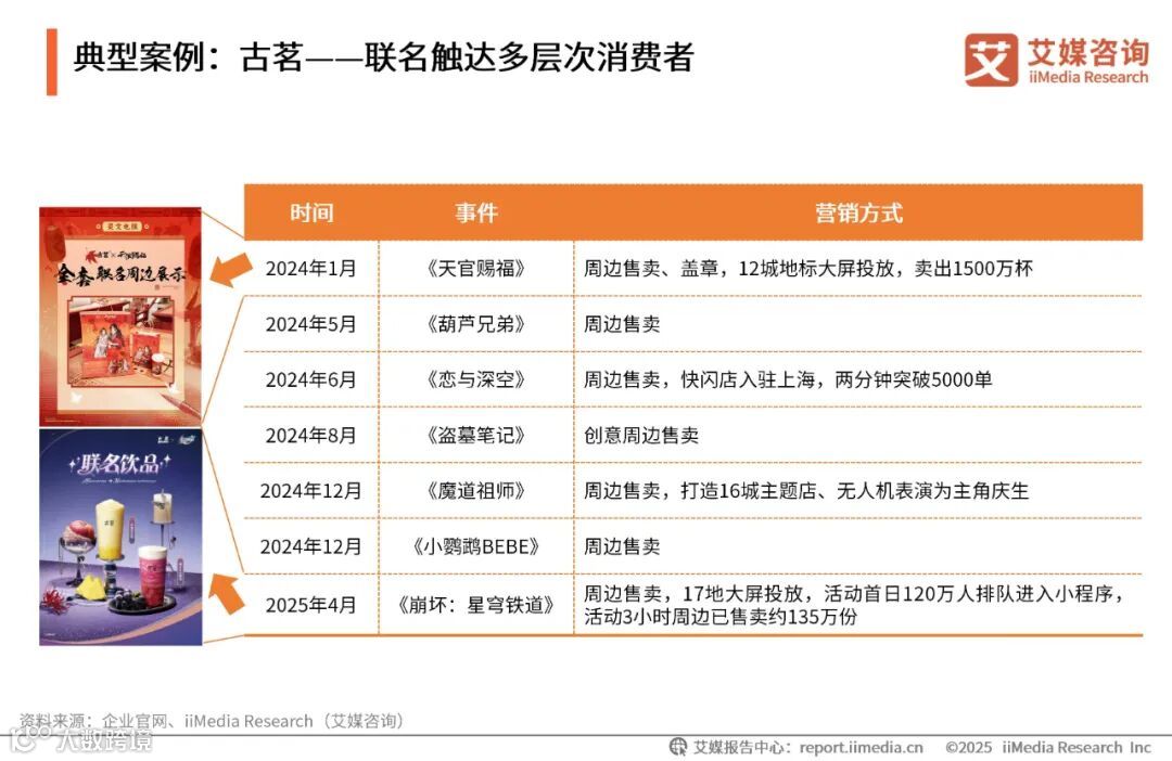 与其他新式茶饮品牌相比,古茗擅长与“二次元”IP深度联名,在联名中精准把握低线城市青年群体兴趣,以熟悉IP和平价组合满足其潮流需求;同时,借IP的文化属性与互动玩法,寻求进入新一线城市的契机,成功让二次元营销成为触达不同层级用户的高效纽带。
