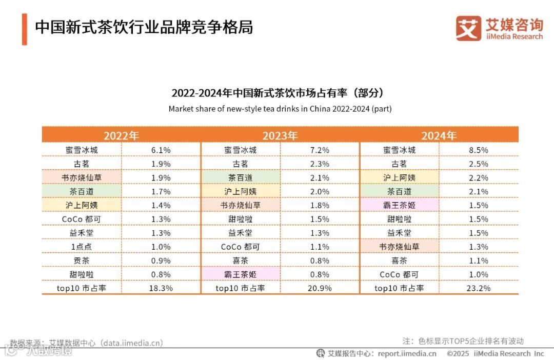 数据显示,2022-2024年,中国新式茶饮市场竞争激烈,多数品牌份额持续波动。头部品牌优势稳固,市场集中度提升,2024年蜜雪冰城以8.5%的市场占有率居龙头地位。霸王茶姬异军突起,增长势头强劲。艾媒咨询分析师认为,新式茶饮中低端市场拥有广泛的消费群体基础,占据主导地位;而高端市场占有率上升,反映了整体消费水平的提升。