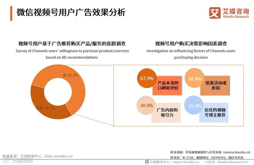 iiMedia Research(艾媒咨询)数据显示,62.3%的视频号用户会因为广告推荐而去购买相关产品或服务。其中,67.3%的用户是因为产品本身的口碑和评价而购买;60.4%的用户则是因为优惠活动或折扣而购买。艾媒咨询分析师认为,视频号用户呈现出明显的价格敏感特点,他们倾向于寻找性价比高的产品或服务,广告主可通过提供折扣、优惠券、特价商品或捆绑销售等促销方式来提高转化率。