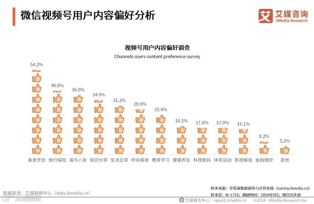 iiMedia Research(艾媒咨询)数据显示,视频号用户较为喜爱的视频内容为美食烹饪、旅行探险及娱乐八卦,占比分布是54.2%、40.8%和38.0%。艾媒咨询分析师认为,娱乐性强的内容理解门槛低、贴近用户日常生活,用户更乐于观看此类内容。