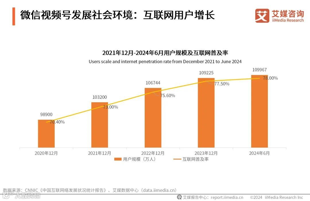 数据显示,截至2024年6月,中国互联网用户规模已达到109967万人,较2023年12月增长742人;互联网普及率达到78.00%,较去年有小幅增长。艾媒咨询分析师认为,近年来,中国互联网用户规模和普及率增长迅速,网络已逐渐融入大多数民众的生活。