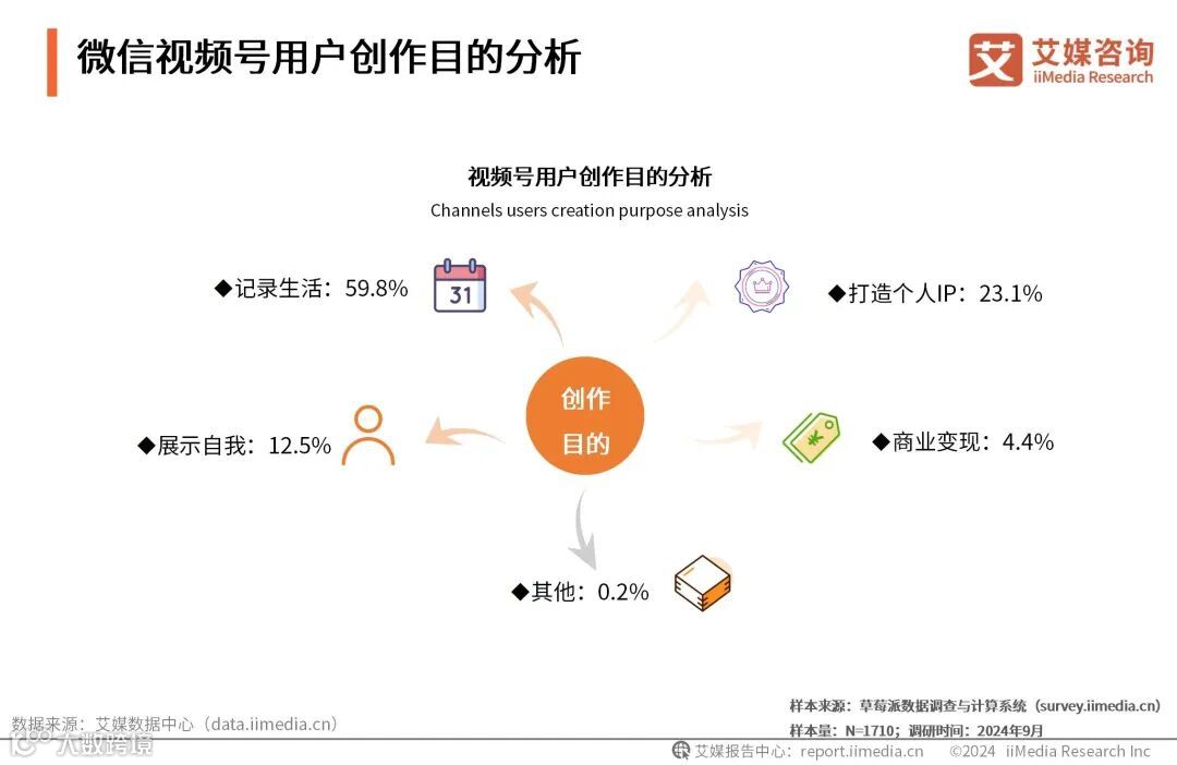 iiMedia Research(艾媒咨询)数据显示,59.8%的视频号用户出于记录生活的目的创作视频,23.1%是为了打造个人IP,12.5%是为了展示自我,仅有4.4%是为了商业变现。艾媒咨询分析师认为,社交媒体承担了个人回忆录和数字日记本的功能,平台可推出相应的活动以此提高用户的活跃度。