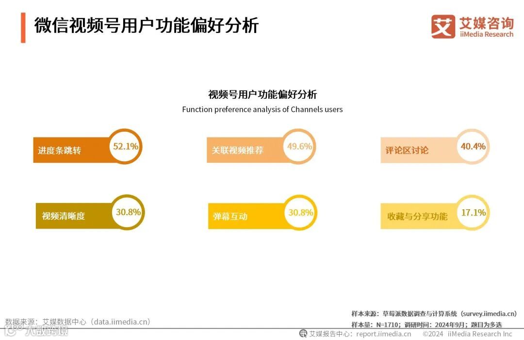 iiMedia Research(艾媒咨询)数据显示,52.1%的视频号用户认为进度条跳转的功能很重要;其次是关联视频推荐及评论区讨论功能,占比为49.6%和40.4%。艾媒咨询分析师认为,平台推荐系统能够快速帮助用户找到喜欢的视频,而评论区的讨论功能是短视频APP社区文化的重要组成部分,它允许用户对视频内容进行互动和讨论,这种即时反馈机制能够激发用户的参与热情。