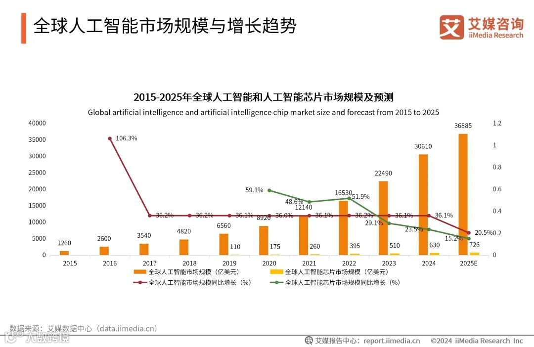 技术创新和应用领域拓展是推动全球人工智能市场规模增长的主要因素。数据显示,全球人工智能市场规模和人工智能芯片市场规模均呈现显著的增长趋势。2015年,全球人工智能市场规模为1260亿美元,预计到2025年,全球人工智能市场规模将达到36885亿美元。2019年全球人工智能芯片市场规模仅110亿美元,2025年预计将增长至726亿美元。