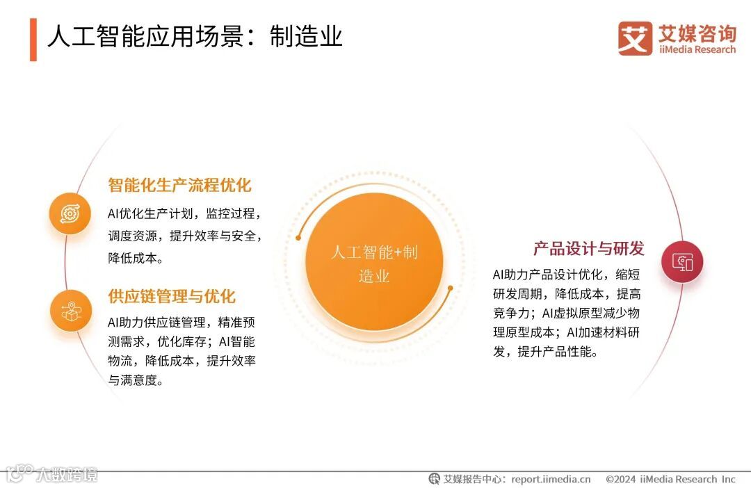 人工智能在制造业的应用正日益深化,通过智能化生产流程优化,AI能够提升生产效率与安全性,降低成本。在供应链管理与优化方面,AI精准预测需求,优化库存,并通过智能物流提升效率与满意度。在产品设计与研发中,AI助力缩短研发周期,降低成本,同时通过虚拟原型和材料研发加速创新,提升产品性能,为制造业带来革命性变革。