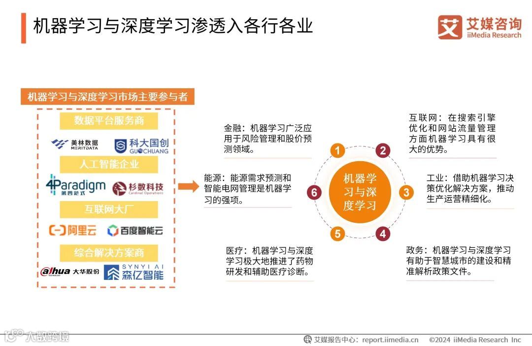 目前,机器学习与深度学习市场的主要参与者包括基础层的数据平台服务商、以大数据技术为核心的人工智能企业、具有强大数据处理能力的互联网大厂和基于传统软件优势的综合解决方案厂商。机器学习与深度学习的主要应用领域覆盖金融、互联网、工业、政务、医疗和能源等领域。其中金融赛道与机器学习契合度高且需求强烈,机器学习在金融领域的应用场景主要在风险管理、股价预测等方面。