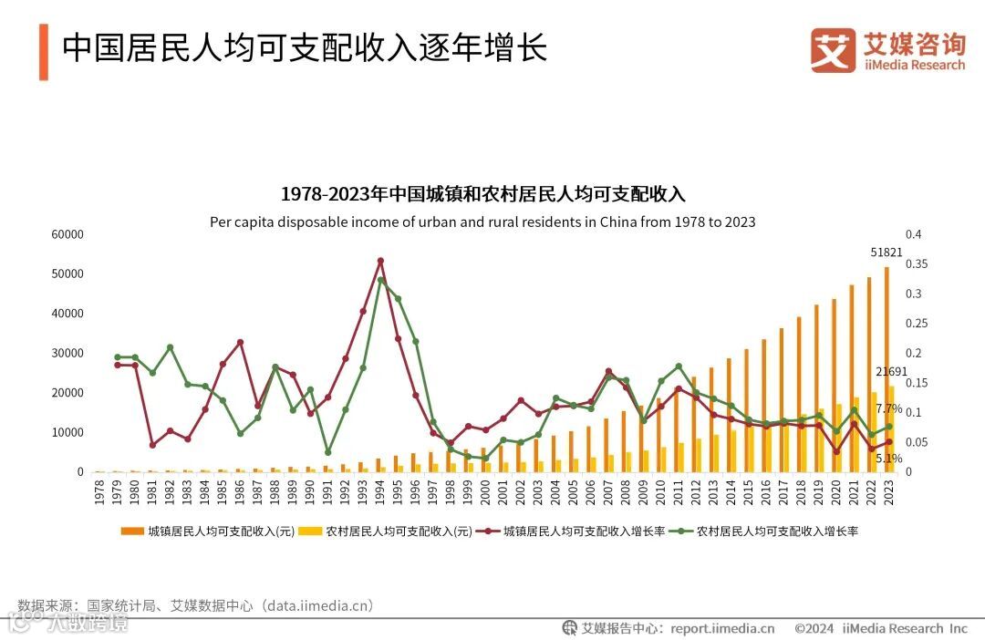 数据显示,从1978年至2023年,中国城镇居民人均可支配收入由343元增长至51821元;农村居民人均可支配收入由134元增长至21691元。可支配收入的增加使得下沉市场居民的消费需求更加多样化和个性化,除了传统的餐饮外卖,他们对生鲜、水果、日用品、药品等商品的外卖需求也在逐渐增加,这为外卖行业的业务拓展提供了一定的增长空间。