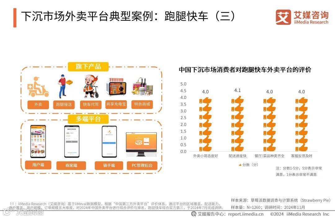 跑腿快车旗下主营外卖、跑腿接送、快车代驾、共享充电宝和特产商城等业务,凭借多端平台的无缝连接形成商业闭环。iiMedia Research(艾媒咨询)数据显示,消费者对跑腿快车平台的使用满意度较高,在外卖小哥态度、配送速度、餐厅/菜品种类和客服反馈方面,均打出了4.0分及以上的分数。跑腿快车凭借其精细化运营与优质服务,在下沉市场外卖平台中脱颖而出,2024年,跑腿快车更是荣获中国外卖平台全国第三名[1],得到市场的高度认可。