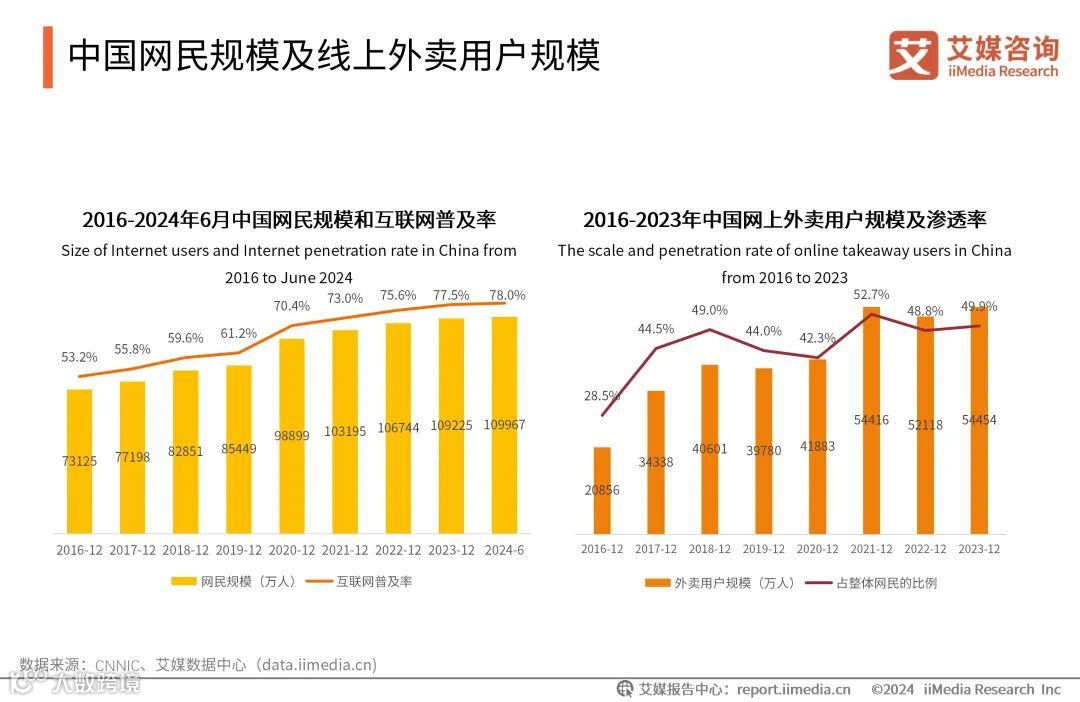 数据显示,中国网民规模和互联网普及率逐年增长,2024年6月中国网民规模达到109967万人,互联网普及率达到78.0%。截至2023年12月,中国网上外卖用户规模达54454万人,较2022年12月增加2336万人,占整体网民的49.9%。中国线上外卖用户规模的增长,尤其是下沉市场的快速增长,已经成为外卖行业发展的重要趋势,随着一二线城市市场的饱和,下沉市场正成为外卖行业新的增长引擎。