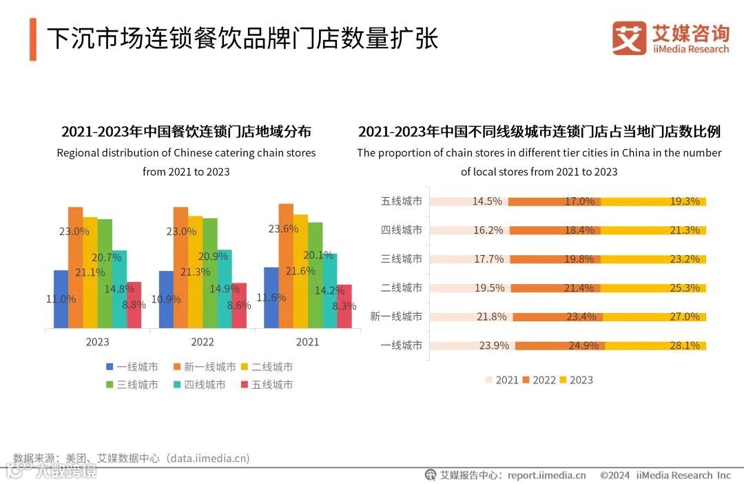 数据显示,从餐饮连锁门店的地域分布看,2022年和2023年有44.0%以上的门店布局在三四五线城市;相较2021年,2023年三四五线城市餐饮连锁门店的数量占比提高了1.7个百分点。从城市连锁化率的变化来看,相较2021年,2023年三线及以上城市的餐饮连锁化率均提升了超过4.5个百分点。随着连锁餐饮品牌在下沉市场扩张步伐的加快,将丰富中小城市和乡镇的餐饮市场,进一步推动下沉外卖市场的发展。