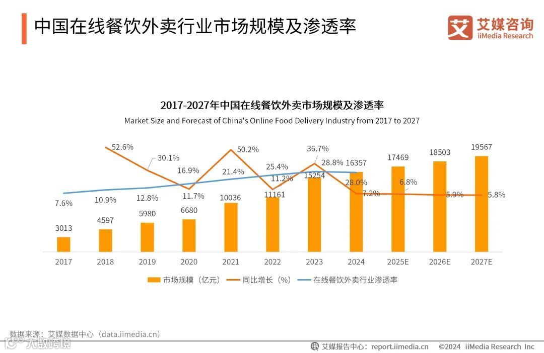 iiMedia Research(艾媒咨询)数据显示,中国在线餐饮外卖行业市场规模在过去十年中呈现出显著的增长趋势,2024年中国在线餐饮外卖行业市场规模为16357亿元,同比增长7.2%,行业渗透率达28.0%。预计未来中国在线餐饮外卖行业规模将进一步增大,2027年达19567亿元。从增长动力来看,一二线城市外卖市场趋于饱和,未来的增长动力将主要来自于三线及以下城市和乡镇地区,下沉市场正成为外卖行业的重要增量来源。