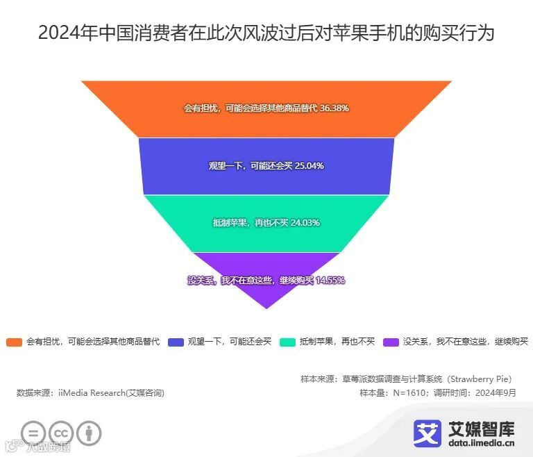 此次苹果与微信的风波后,关于是否还会购买苹果产品,不少消费者有自己的思量。iiMedia Research(艾媒咨询)调研数据显示,36.38%的消费者表示会有担忧,可能会选择其他商品替代;25.04%的消费者会选择观望一下,可能还会买。而比较坚决的消费者会选择抵制苹果,再也不买(24.03%),以及不在意、继续购买(14.55%)。