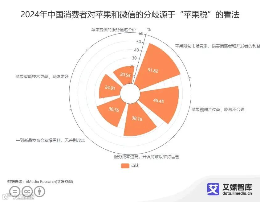 “苹果税”的问题不仅困扰着厂商,也影响到了消费者。iiMedia Research(艾媒咨询)调研数据显示,51.82%的消费者认为苹果限制市场竞争,损害消费者和开发者的利益;45.45%的消费者认为“苹果税”佣金过高、收费不合理,38.18%的消费者则认为“苹果税”会让服务成本过高,开发商难以维持运营。