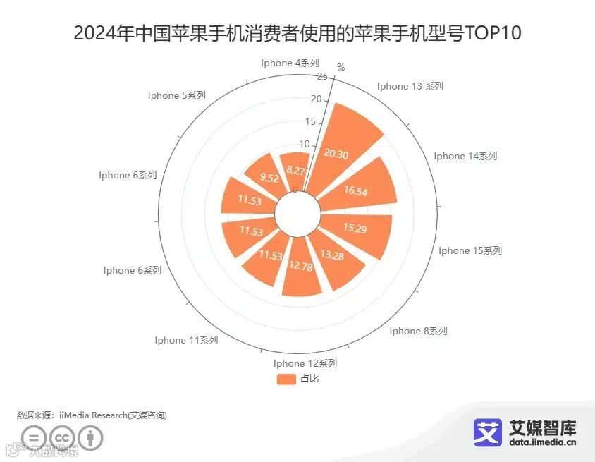 其中苹果产品使用比例最高的是iPhone13系列(20.30%)、iPhone14系列(16.54%)、iPhone15系列(15.29%)、iPhone 8系列(13.28%),以及iPhone 12系列(12.78%)。