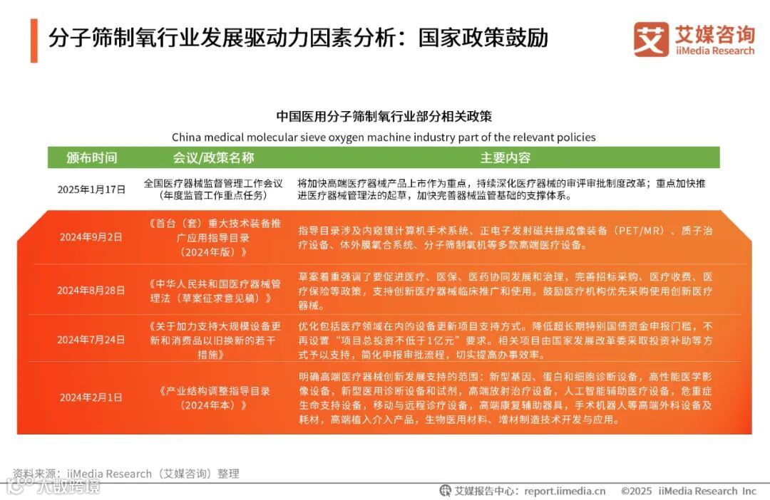 国家出台的一系列政策,为医用分子筛制氧行业注入强大动力。从规范标准到扶持研发,政策全方位激发行业活力。企业积极响应,产品性能不断优化,应用范围持续拓展。艾媒咨询分析师认为,国家及地方政策鼓励医用分子筛制氧机行业朝高质量发展,为医疗健康事业筑牢根基。