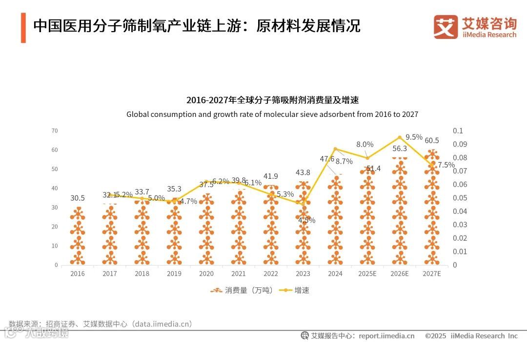 数据显示,2016-2027年全球分子筛吸附剂消费量从30.5万吨持续增长至预计的60.5万吨,增速虽有波动但整体保持在较高水平。艾媒咨询分析师认为,全球分子筛吸附剂消费规模稳步攀升,显示出市场需求的强劲,国内相关产业如分子筛制氧产业有望凭借广阔市场空间迎来良好发展机遇。
