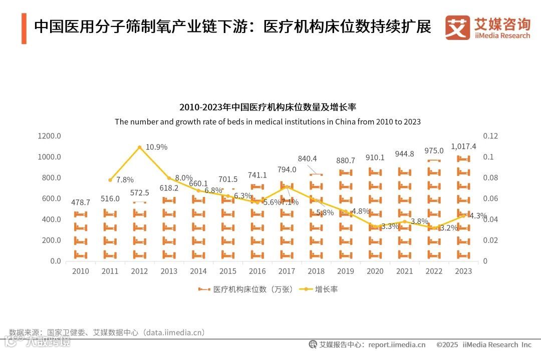数据显示,中国医疗卫生机构病床数量从2010年的478.7万张增长到2023年的1017.4万张,年均复合增长率为6.0%。艾媒咨询分析师认为,医用分子筛制氧设备及系统的终端一般直接连接到床位,床位数的增长不仅代表着医疗机构收治能力的提升,也意味着更多患者对氧气治疗存在需求,这直接驱动了医用分子筛制氧设备及系统市场规模的持续扩张 。